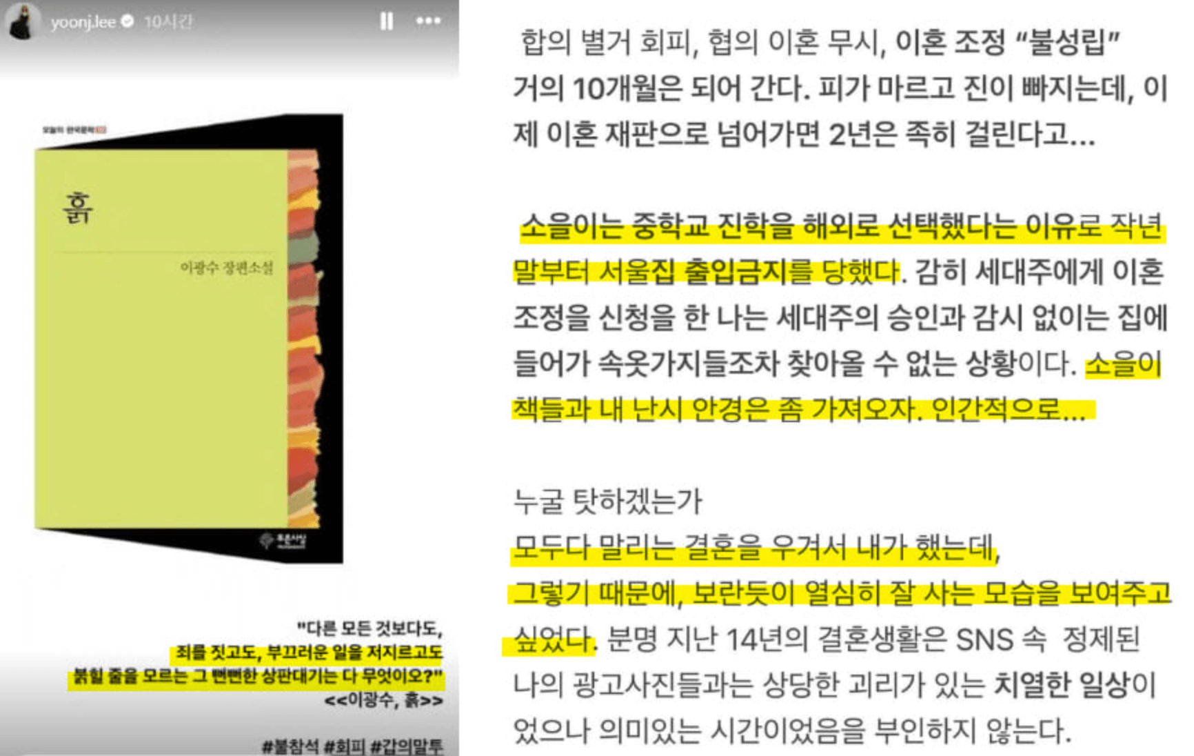 이윤진 씨가 이광수 씨의 장편소설 흙을 인용하며 "다른 모든 것보다도, 죄를 짓고도, 부끄러운 일을 저지르고도 붉힐 줄을 모르는 그 뻔뻔한 상판대기는 다 무엇이오?" 인스타 스토리를 올렸습니다. 또한 딸이 해외로 중학교를 진학했다는 이유 때문에, 현재 이혼 조정 중인 이범수씨가 집에 출입금지를 시켰다는 내용도 올렸지요. 두고온 소지품조차 챙기지 못하는 답답한 상황을 온라인에 공개했습니다.