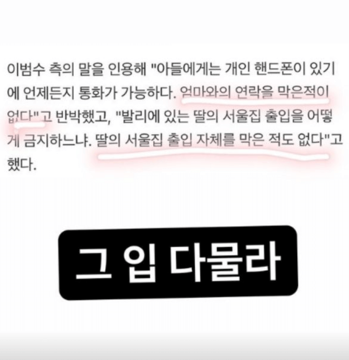 이윤진씨는 세 번째 게시물에 좀 더 과격한 글을 쓴 스토리를 올렸습니다. 이범수씨의 통제로 인해 아들과 연락이 닿지 않는다는 이윤진씨의 주장과 앞서 딸의 집 출입을 금지 시켰다는 것에 대해 이범수씨가 반박하자, "그 입 다물라"라며 그가 말한 것이 사실이 아니라는 것을 주장했습니다. 이 글이 올라오자마자 많은 사람들이 큰 관심을 보였어요.